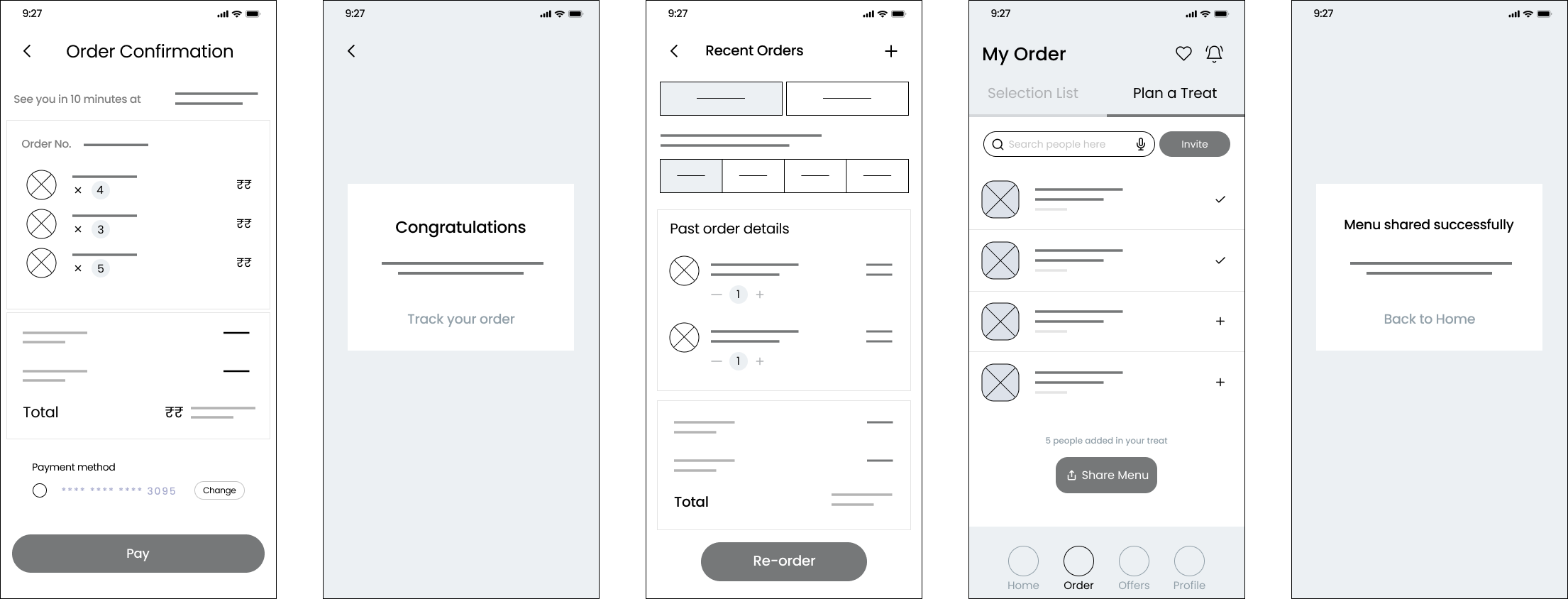 I designed complete user journeys, which included the home page, pages for the order section with group order functionality under 'Plan a Treat,' menu item details, bag, checkout, payment and confirmation, past orders accessible via the profile, notifications, and available offers.