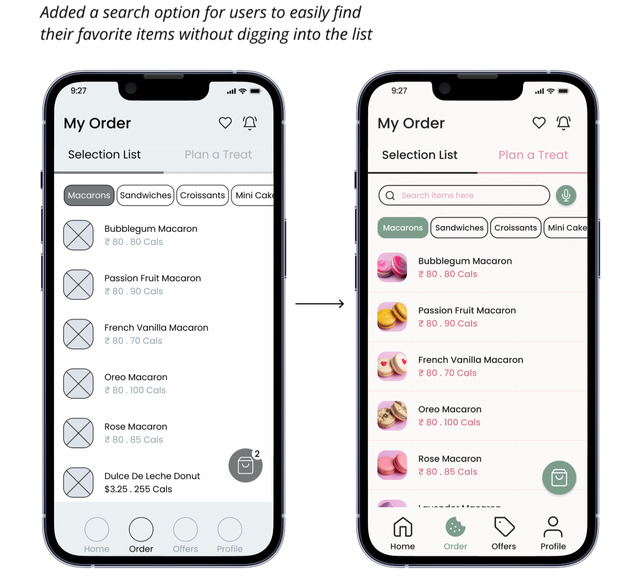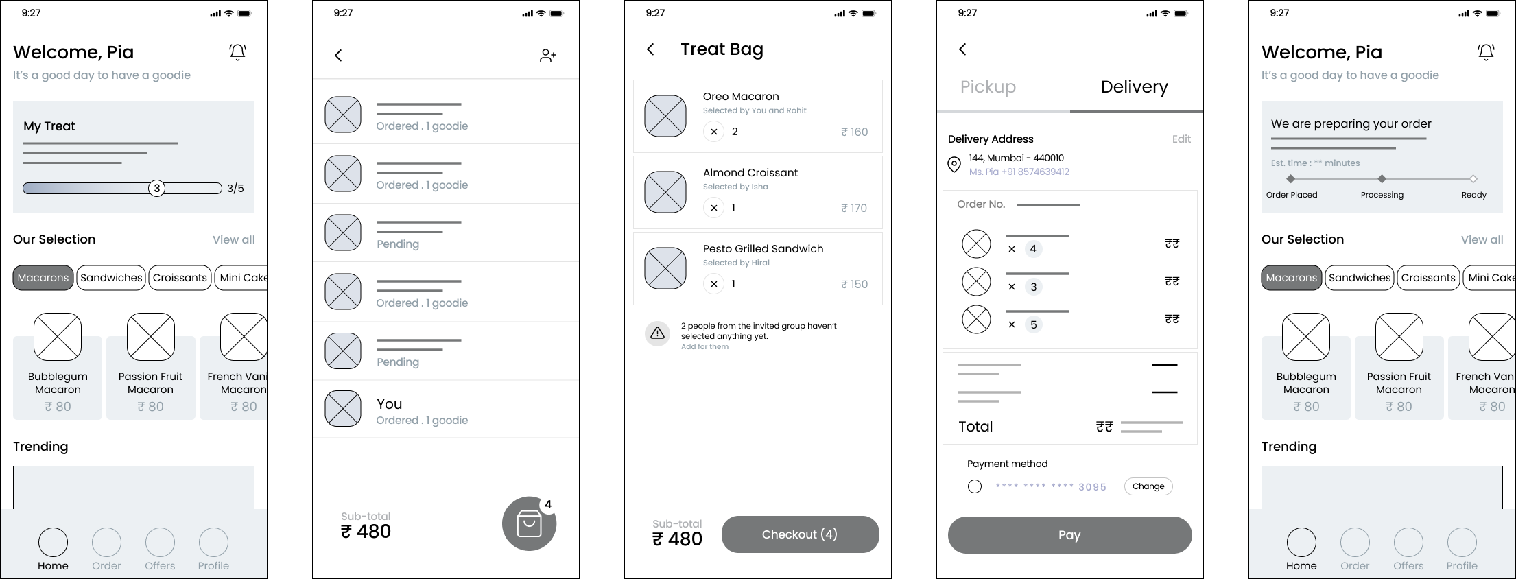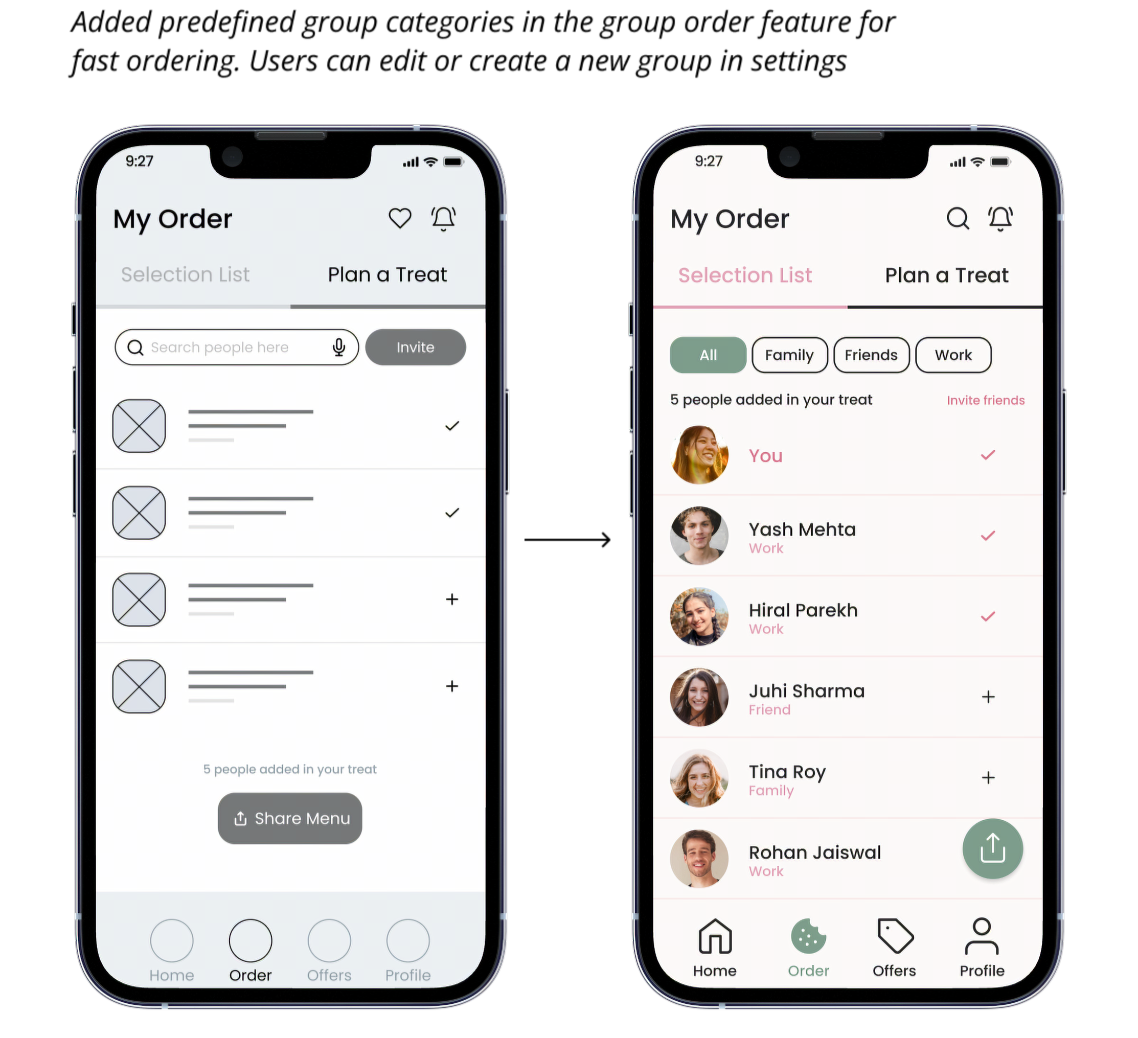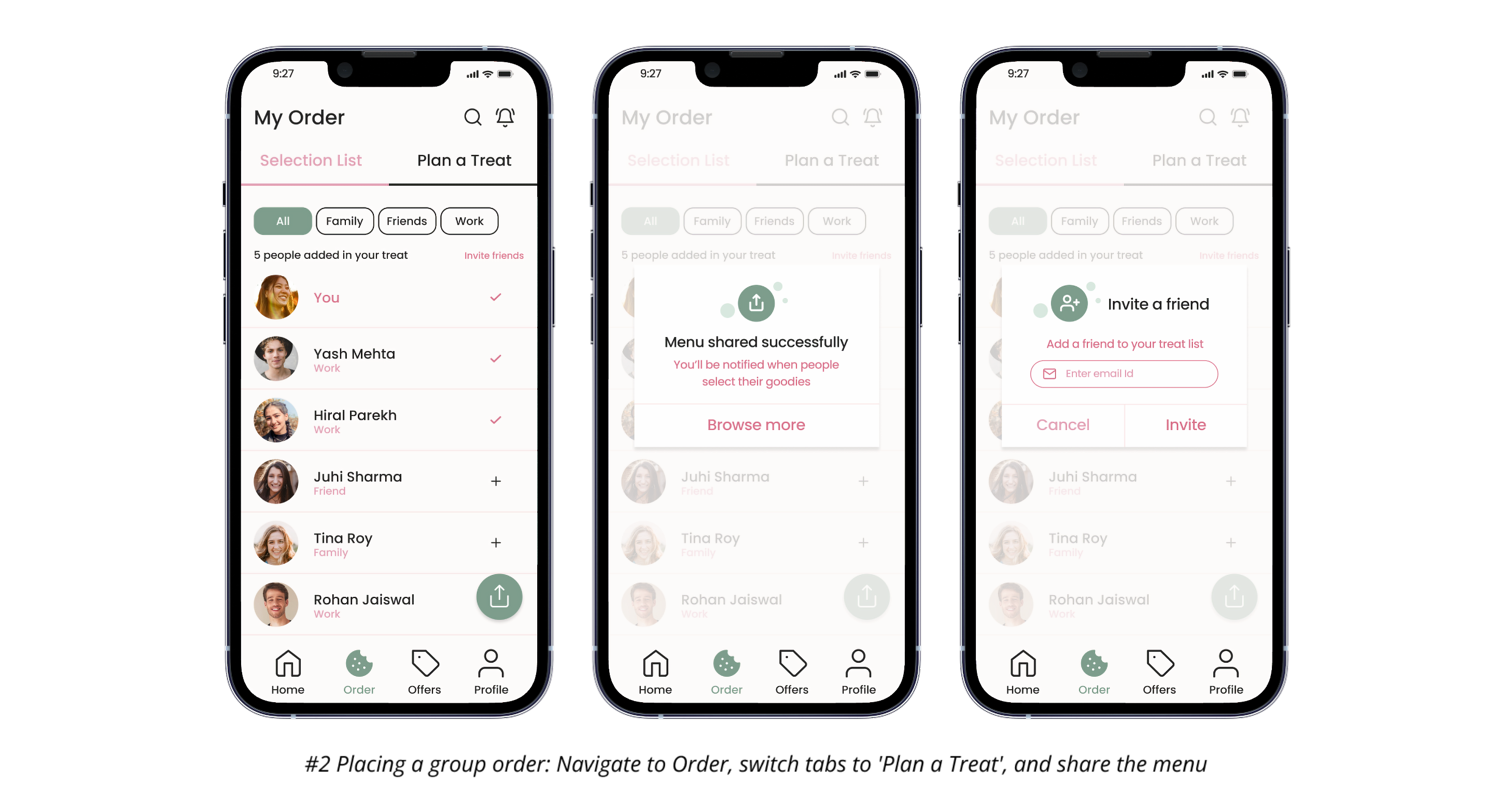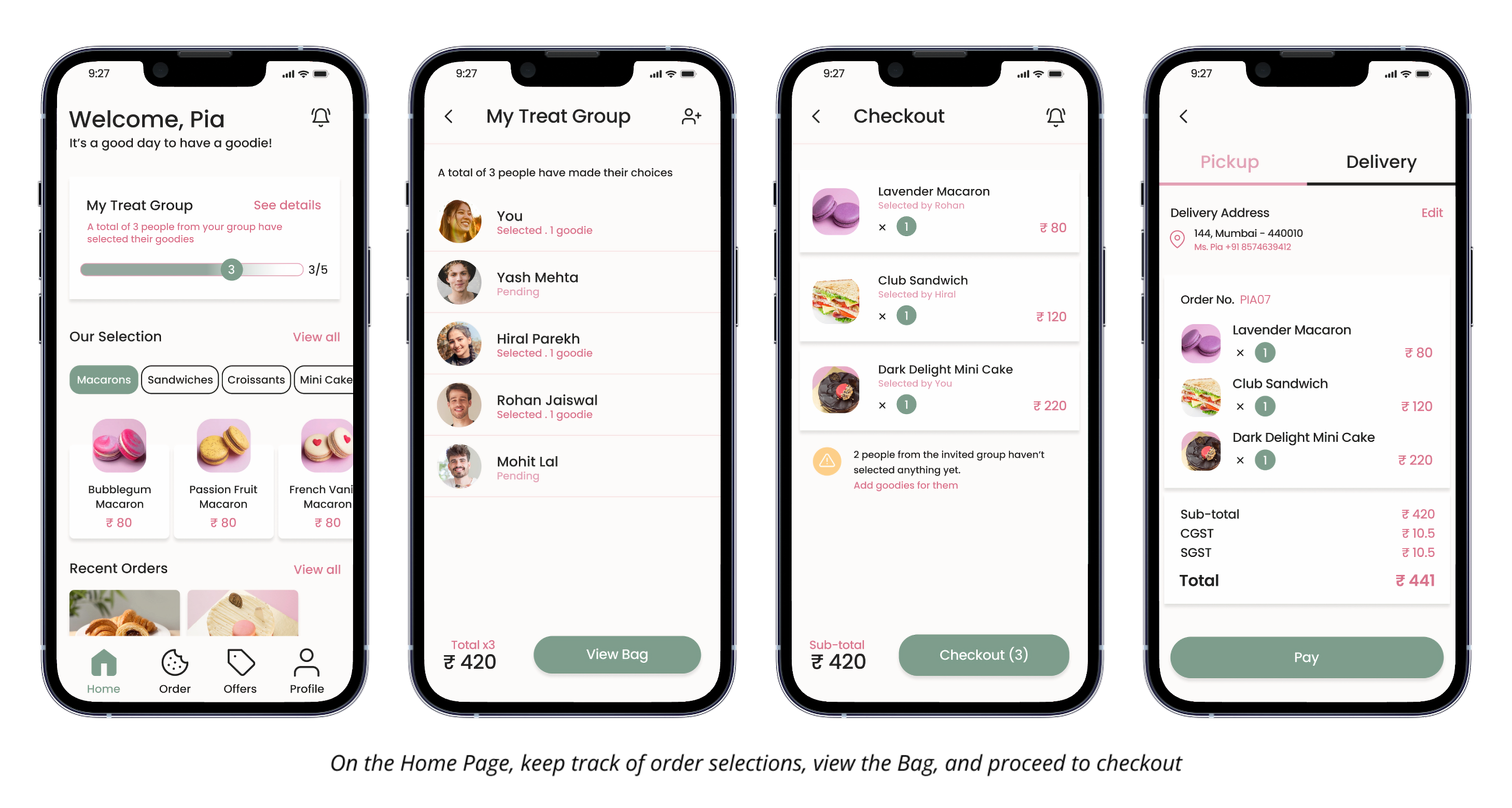I designed a mobile app for online bakery ordering with a feature that allows users to treat friends and family to their chosen items by sharing the menu and placing group orders.